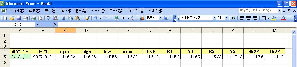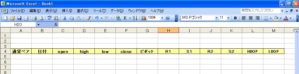 左から順に、通貨ペア、日付、open、high、low、close、ピボット、R1、S1、R2、S2、HBOP、LBOP