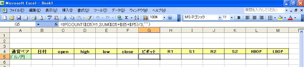 つづいて、ピボット、R1、S1、R2、S2、HBOP、LBOPのそれぞれに以下の計算式を入れます。